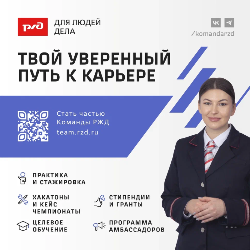 • Вы сможете участвовать в российских и международных саммитах, форумах, слетах бизнес-блоков компании в составе молодежного сообщества РЖД;