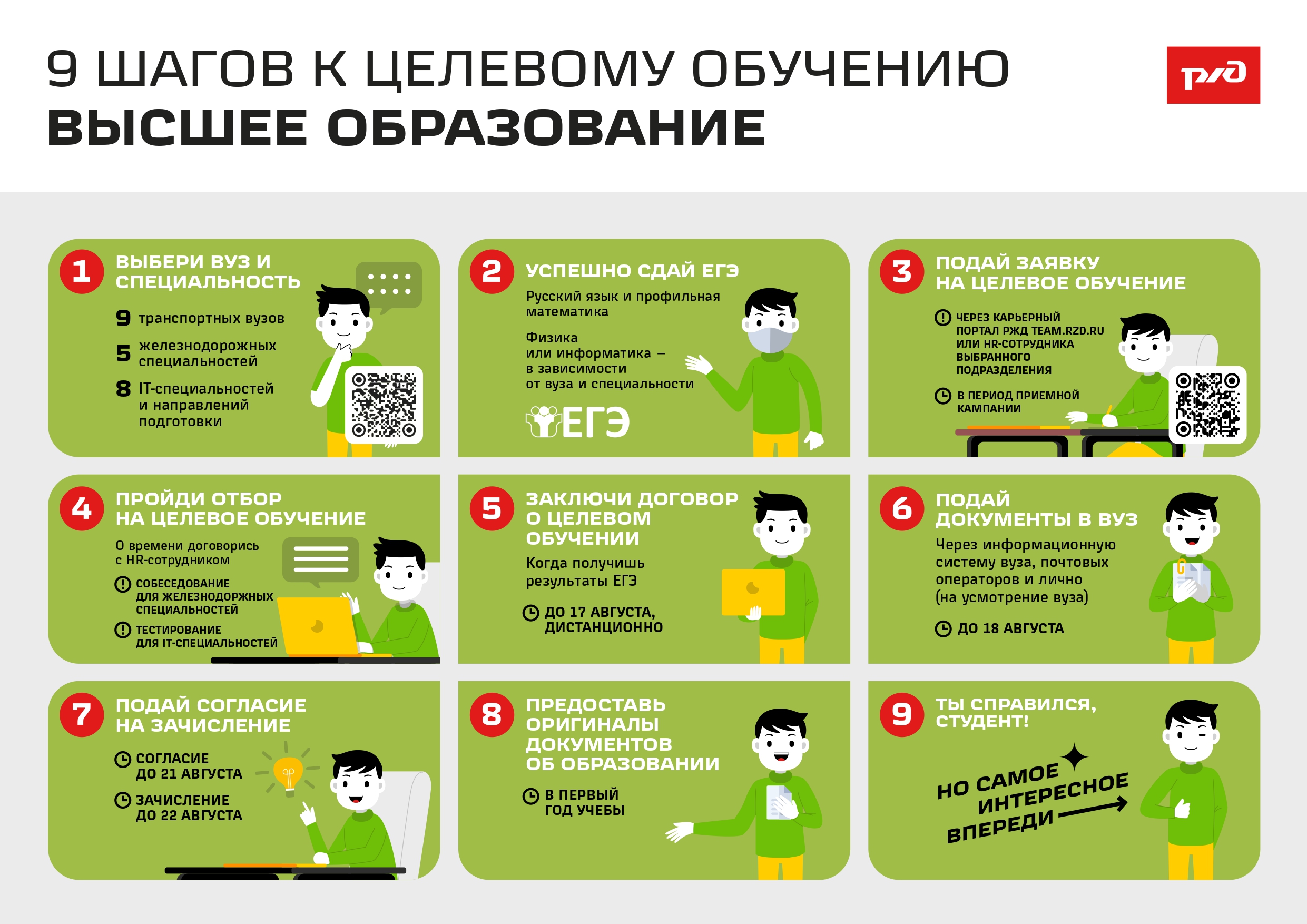 Для получения целевого направления на обучение необходимо подать заявку через Карьерный портал РЖД - https://team.rzd.ru/activities/76