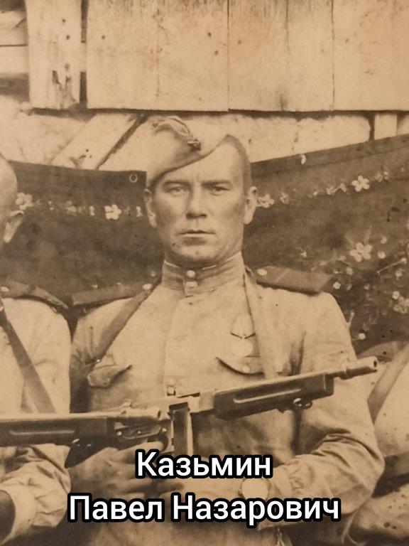 Также войну прошел мой прапрадедушка Казьмин Павел Назарович. Он получил медаль «За боевые заслуги», имел звание ефрейтора. Его фото и письмо с фронта сохранилось до наших дней. Даже под свист пуль, бесконечно летящих над головой, он писал жене о своей любви к ней.