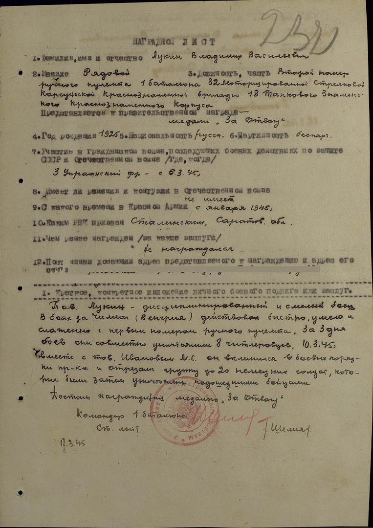 Попал в 32 Корсунь-Шевченковскую ордена Красного Знамени мотострелковую бригаду 18 танковой армии 3-го Украинского фронта под командованием маршала Ф.И.Толбухина. Распределили по специальностям, обучали обращению с боевым оружием. Владимир стал вторым номером при ручном пулемёте. Личным оружием был карабин. После обучения стали выдвигаться на передовые позиции в район озера Балатон, где шли ожесточённые бои. Так началась для Владимира настоящая война. Привык к крови, жестокости. Привык не бояться смерти: в бою о ней не думаешь – уверен, что она тебя минует. Когда убили пулемётчика, воевал стрелком-автоматчиком. В марте 1945 года был ранен. Победу встретил в провинциальном венгерском городке Залаэгерсег.