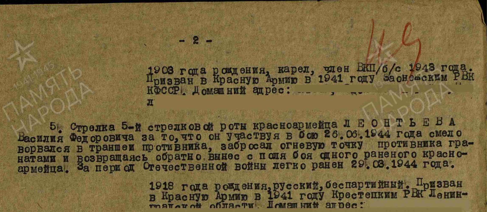 Мой прадед по отцовской линии, Леонтьев Василий Федорович родился зимой в январе 1908 году в деревне Курино Новгородской области, Крестецкого района. За всю свою жизнь Василий Федорович повидал и поучаствовал в 2 войнах: Финской и в Великой Отечественной. До призыва на войну Василий уже был женат. Призвали его в самом начале войны в 1941 году в Крестецкий РВК, Ленинградской обл., Крестецкого района. Призвали его уже в зрелом возрасте (ему было 33 года) и поэтому он был обучен военному делу. Попал он в воинскую часть 345 стрелковый полк 27 стрелковой дивизии. Сам он был Красноармейцем.