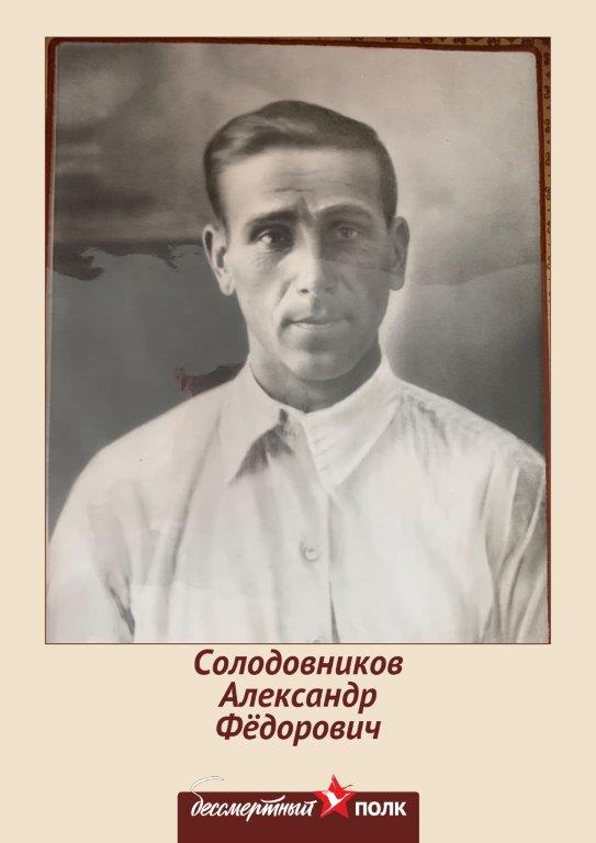 Мой прадедушка Солодовников Александр Федорович родился в 1905 году в селе Новоникитино Оренбургской области. Шофер 4-й роты Отдельного батальона автоцистерн. В Красной армии с июля 1941г. Выполнял работы по подвозу ГСМ (горюче-смазочных материалов) фронту. Даже работал на «Дороге жизни» и доставлял грузы в окруженный Ленинград.Награжден медалью «За оборону Ленинграда» и медалью «За Боевые Заслуги».