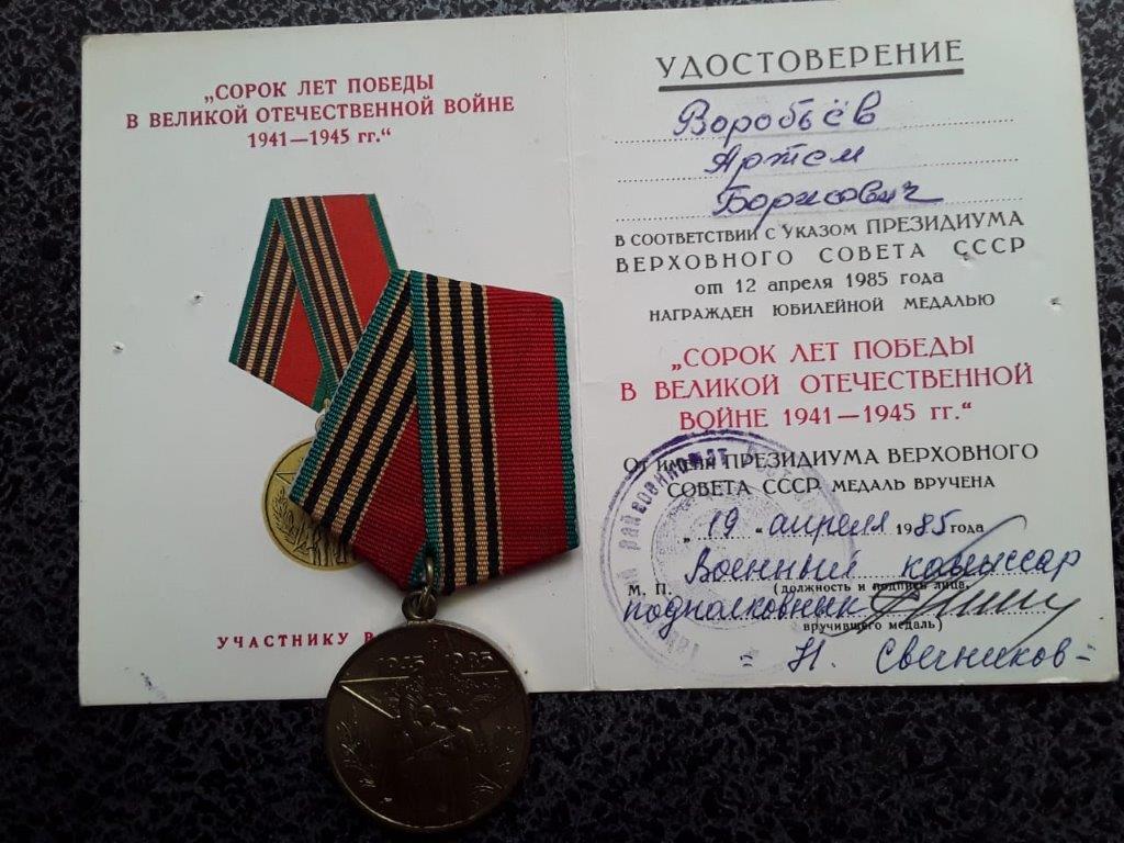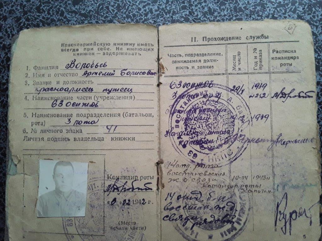 Мой прадедушка Воробьев Артем Борисович участвовал в Великой Отечественной войне. В 1939 году был призван в красную армию на дальний Восток. С первых дней воевал. Был машинистом паровоза, получил звание – красноармеец, должность – путеец в железнодорожном батальоне 14 роты. В 1943 году воевал на 2 и 4 украинском фронте (Винницкая обл., Сумская обл., город Полтава, Курская Дуга). После окончания войны в 1945 году был отправлен на дальний восток дослуживать в армии. Но там началась Японская война. Он принял участие в этой войне, из-за нехватки еды и витаминов он заболел цингой, так же он получил пулевое ранение в шею на этой войне. Умер в 1998 году, в честь него был назван мой троюродный старший брат Артем.