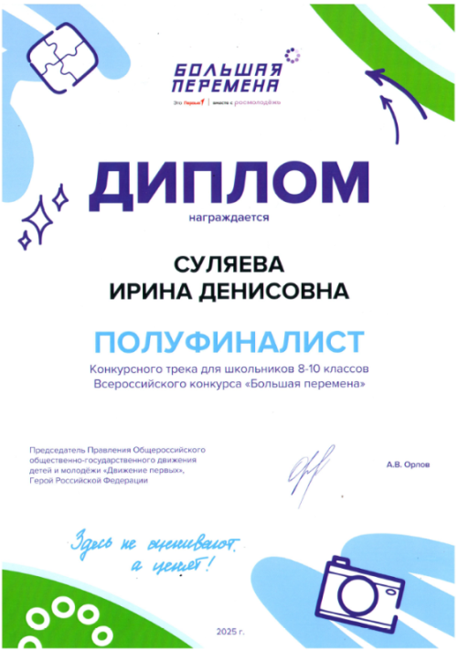 В начале сентября ученица 11Г Суляева Ирина приняла участие в полуфинале федерального проекта «Большая перемена», который проходил в Анапском районе Краснодарского края во Всероссийском детском центре «Смена». «Это был один из самых ярких и продуктивных периодов в моей жизни, ˗ рассказывает Ирина. Полуфинал ˗ это не просто конкурс, это настоящая школа жизни. Мы погрузились в насыщенную конкурсную программу: работали над проектами в командах, посещали мастер-классы от экспертов, учились креативно мыслить и презентовать свои идеи. Самое ценное для меня ˗ это новые знакомства, я познакомилась с талантливыми и целеустремленными ребятами со всей страны».