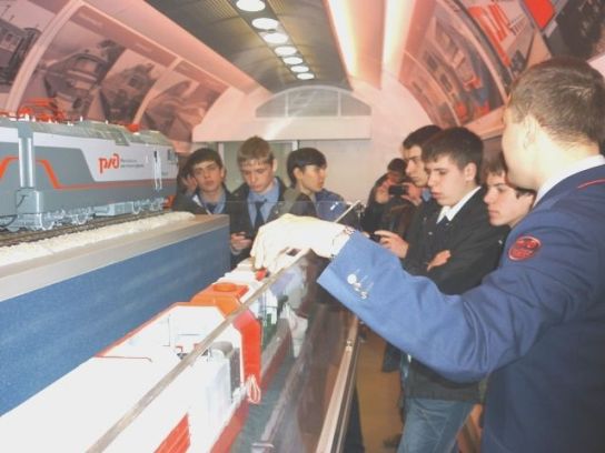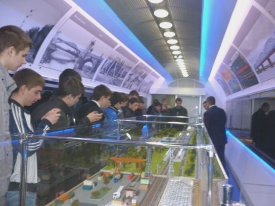 Студенты филиала РГУПС в г. Кропоткине имели возможность ознакомиться с историей развития отечественного железнодорожного транспорта с 1837-2011 гг., увидеть макеты современного подвижного состава ОАО «РЖД», новейшей инфраструктуры железнодорожной сети. Кроме этого, большой интерес у студентов вызвала демонстрация экспонатов продукции, выпускаемой с применением нанотехнологий. Они имели возможность попробовать свои силы на обучающих тренажерах: «Авиасимулятор», «Локомотив 2ЭС5К». Во время экскурсии на мониторах воспроизводились видеоролики и презентационные материалы, посвященные молодежной кадровой политике ОАО «Российские железные дороги».
