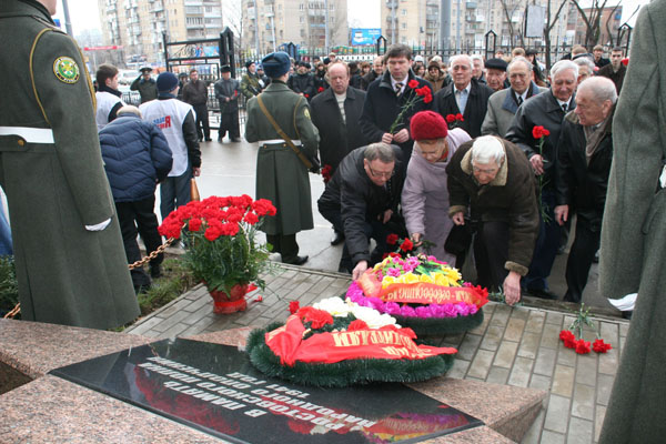 Колонна студентов, ветеранов и гостей возложила цветы к Памятному знаку. Еловые гирлянды, багровые гвоздики, слезы благодарности легли мягким пухом на мраморную Звезду. Минута молчания.