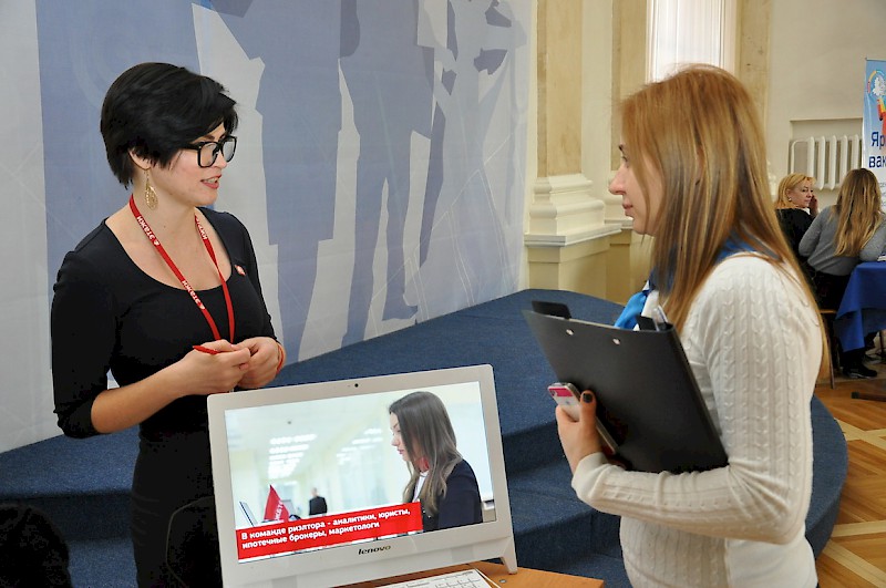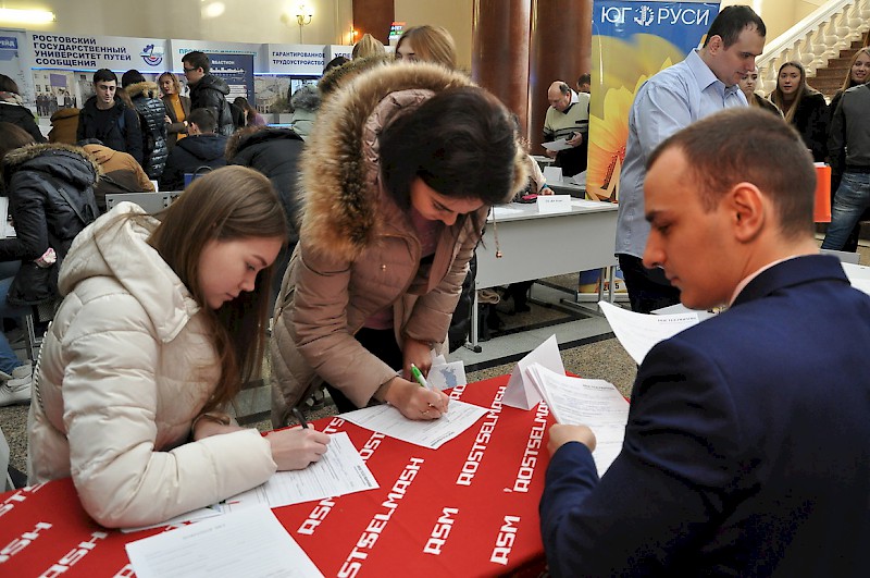 В своем приветственном слове проректор по внешним связям и производственной практике А.Е. Богославский подчеркнул значение социального партнерства в сфере образования как для ВУЗа, так и для работодателей. А затем, свыше 700 студентов университета, в том числе гуманитарного факультета, факультета «Экономики, управления и права», Ростовского техникума железнодорожного транспорта в настоящее время еще не определившиеся со своим трудоустройством, посетили «Ярмарку вакансий».