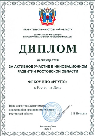 Ростовский государственный университет путей сообщения за активное участие в инновационном развитии Ростовской области награжден Дипломом.