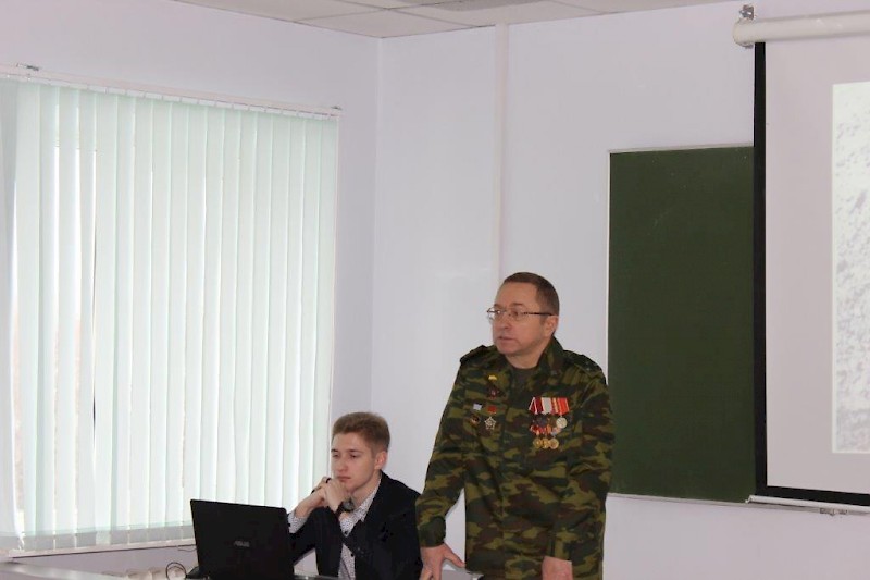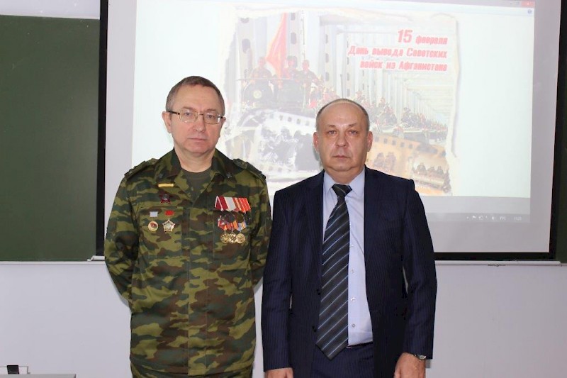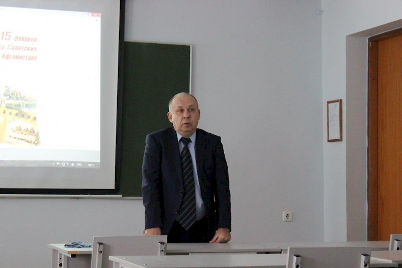 Урок мужества для студентов провел Валерий Иванович Токарев, заведующий лабораторией факультета ЭУП, который в 1984-85 гг. служил в Афганистане офицером в автомобильном батальоне. В.И. Токарев рассказал о геополитической роли Афганистана в обеспечении стабильности в Центральной Азии, о предпосылках и причинах направления ограниченного контингента советских войск в Афганистан и основных этапах афганской войны.