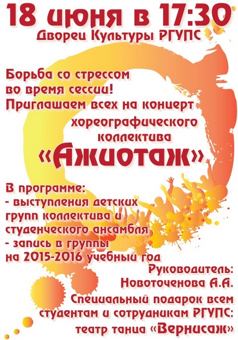 18 июня в 17:30 во Дворце Культуры РГУПС состоится выступление хореографического коллектива "Ажиотаж".