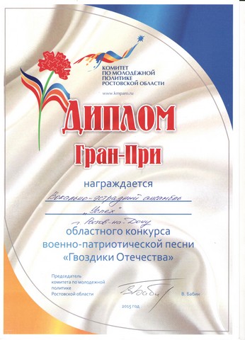 Гран-при конкурса «Гвоздики Отечества» жюри единогласно присудило Народный вокальный эстрадный ансамбль "Успех" ДК РГУПС (руководитель Компаниец А.А.) из Ростова-на-Дону. Они будут представлять Ростовскую область на всероссийском конкурсе патриотической песни.