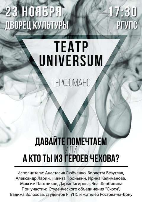 23 ноября во Дворце культуры РГУПС в 17:30 театр "Universum" представляет перфоманс.