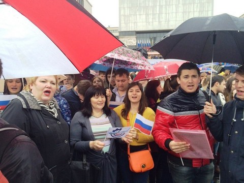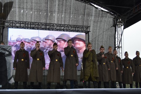 Проливной дождь не помешал участникам мероприятия исполнить Гимн Победе. С центральной сцены тон исполнения задавали солисты Народного вокального ансамбля «Успех» РГУПС под руководством Аси Амбарцумовны Компаниец.