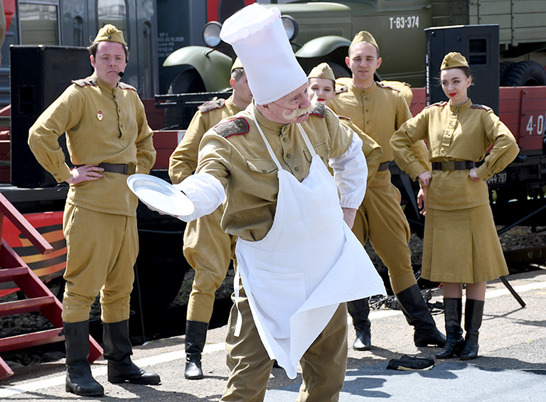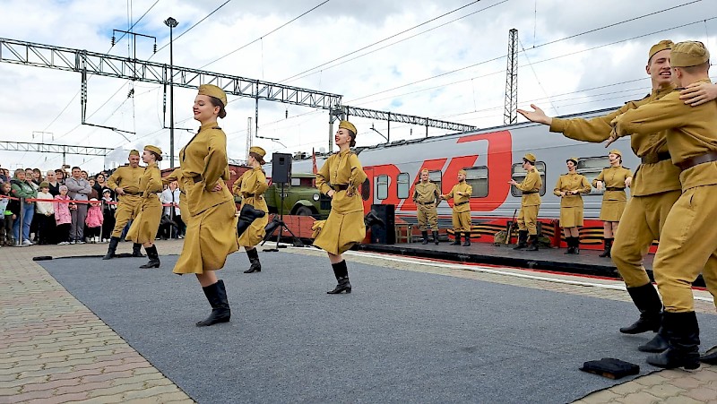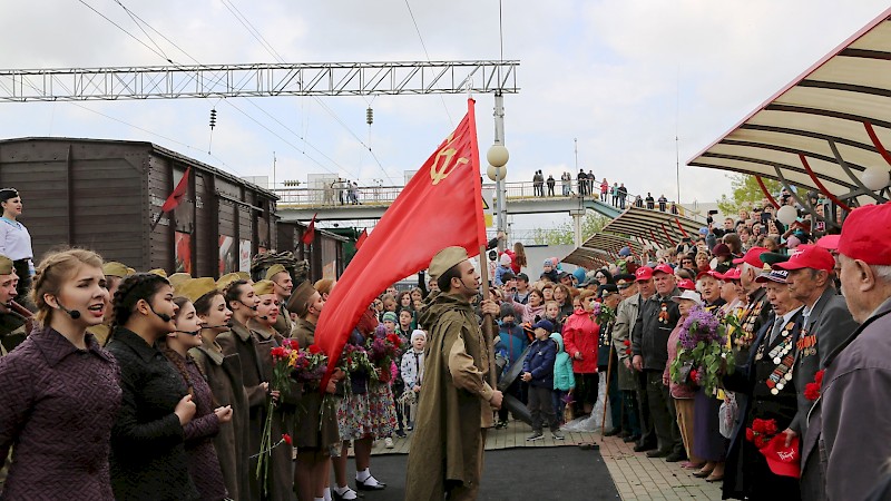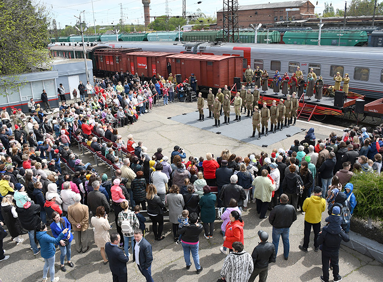 В честь прибытия исторического состава, которое состоялось в рамках традиционного предпраздничного рейса по полигону Северо-Кавказской железной дороги, на перроне вокзала и на железнодорожной платформе было устроено театрализованное представление. Участники мероприятия погрузились в атмосферу 40-х годов прошлого века. В программу представления были включены тематические вокальные и танцевальные номера, отрывки из литературных произведений, с которыми выступили творческие коллективы Дворца культуры СКЖД и студенты ансамбля «Успех» РГУПС.
