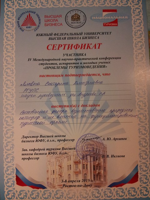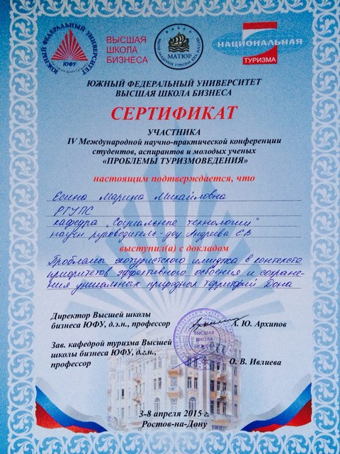 3-4 апреля 2015 г. на базе Высшей школы бизнеса Южного федерального университета проходила IV Международная научно-практическая конференция студентов, аспирантов и молодых ученых «Проблемы туризмоведения».