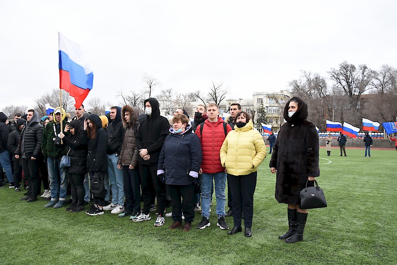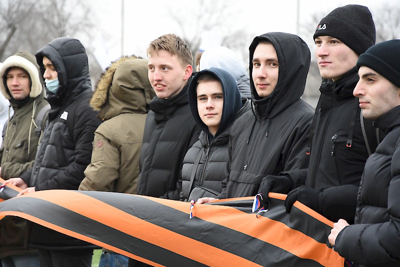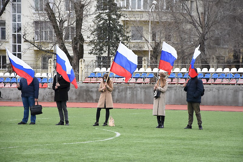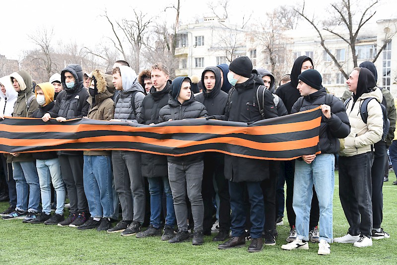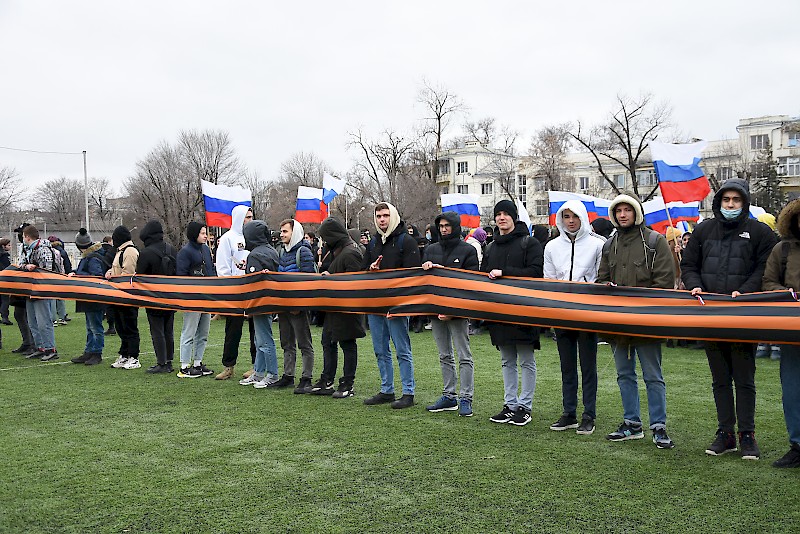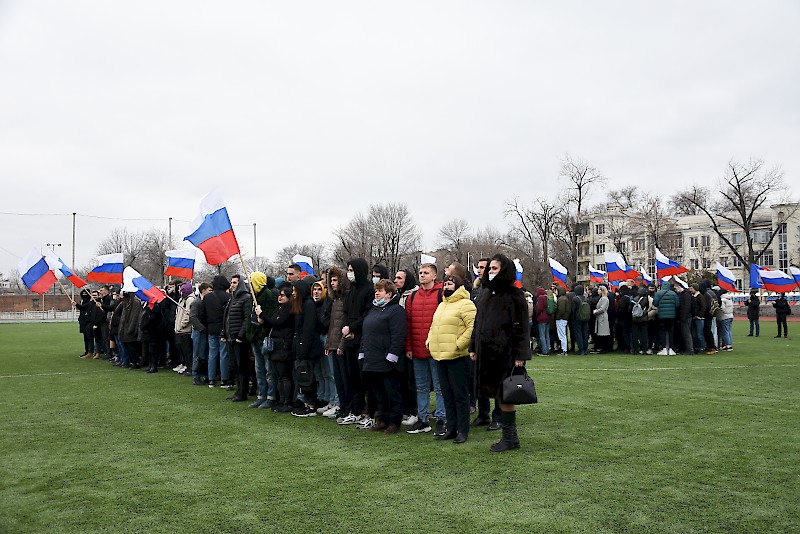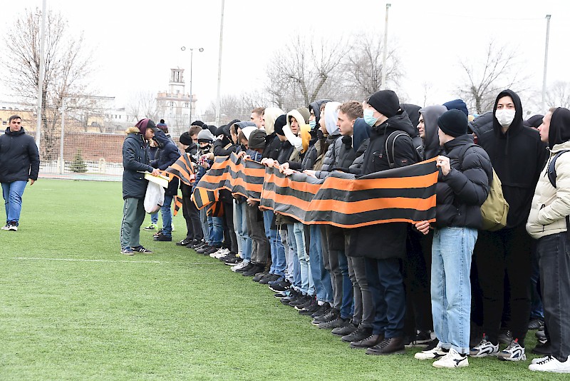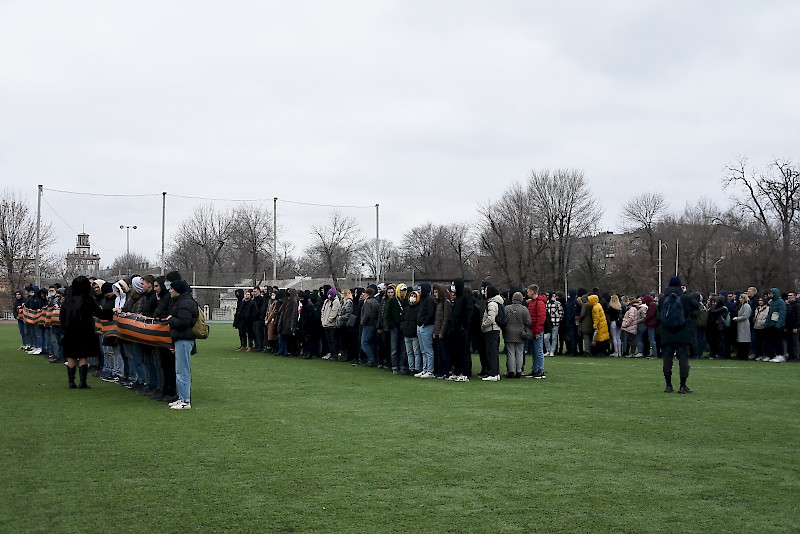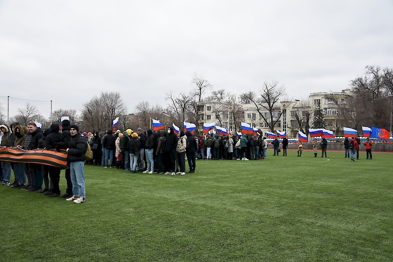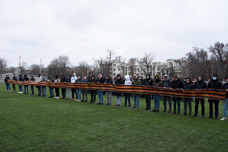 На стадионе Ростовского государственного университета путей сообщения студенты провели флеш- моб: выстроились в форме буквы Z- символа единства, развернули флаги Российской Федерации и огромную Георгиевскую ленточку. Студенты вуза поддерживают российскую армию и желают скорейшего мира.