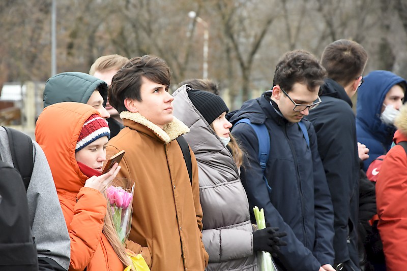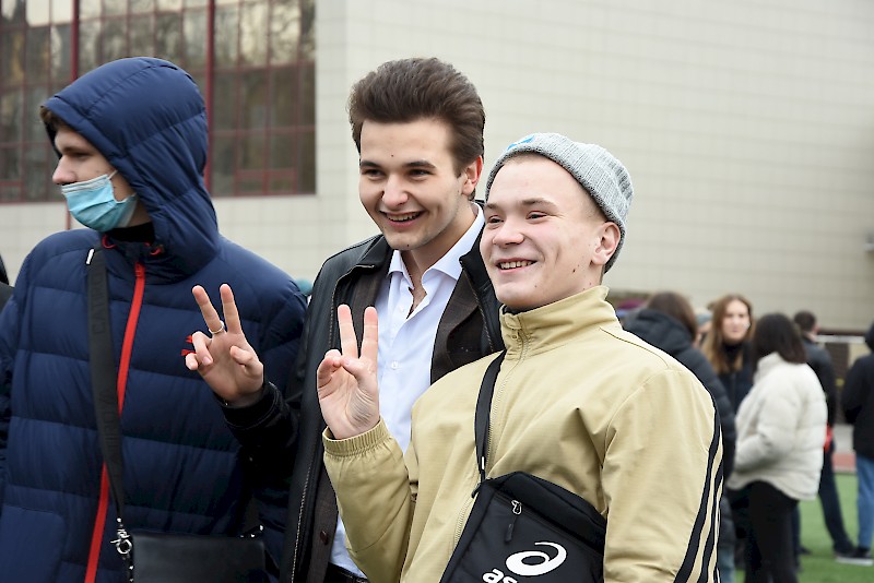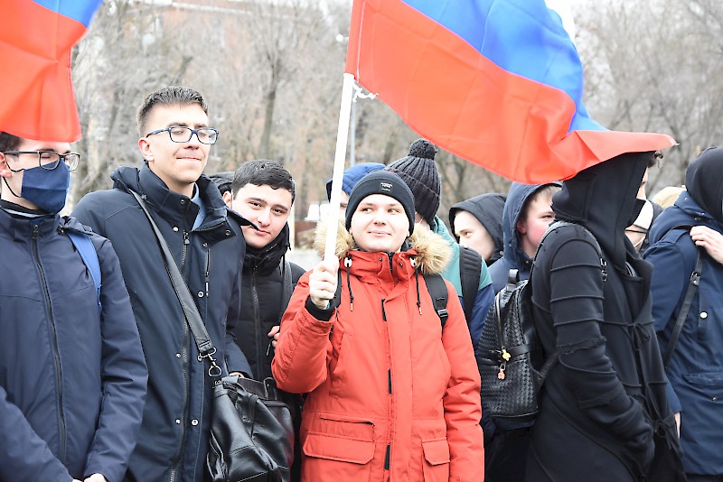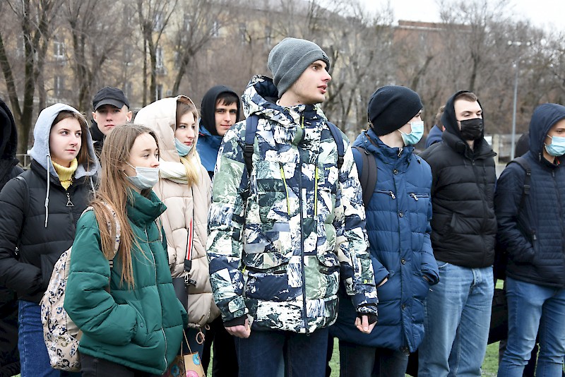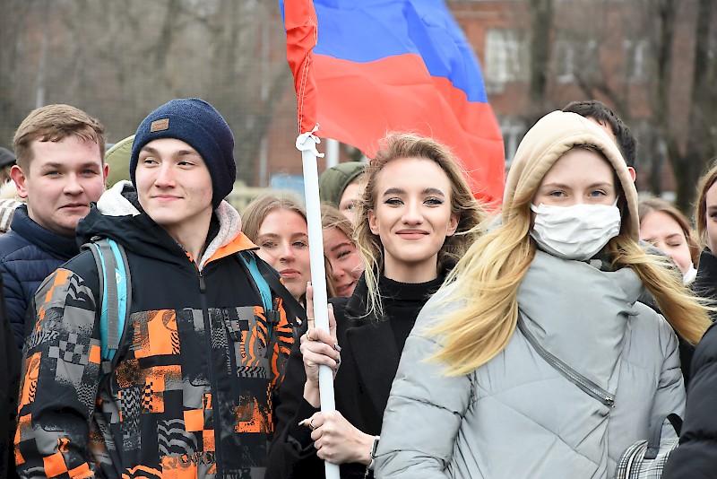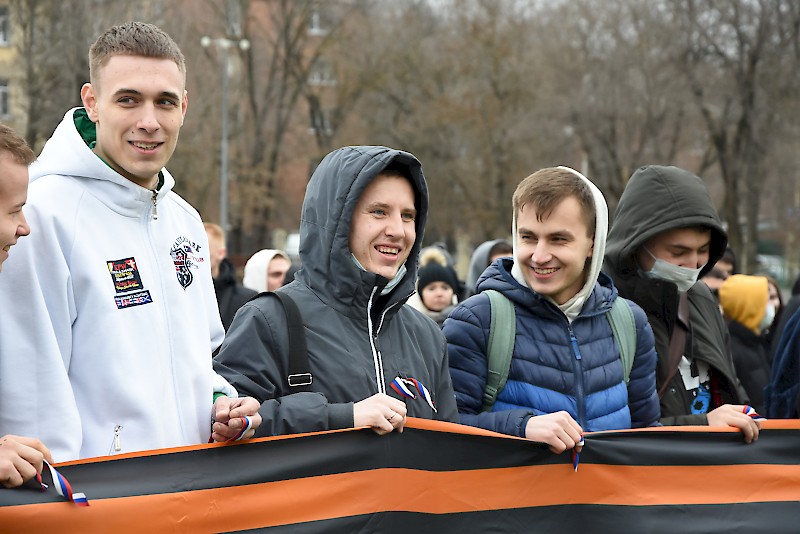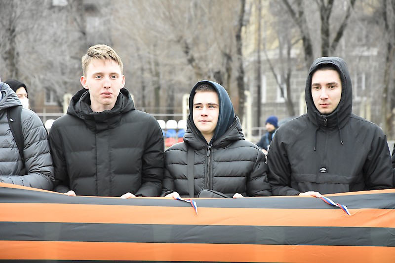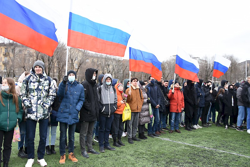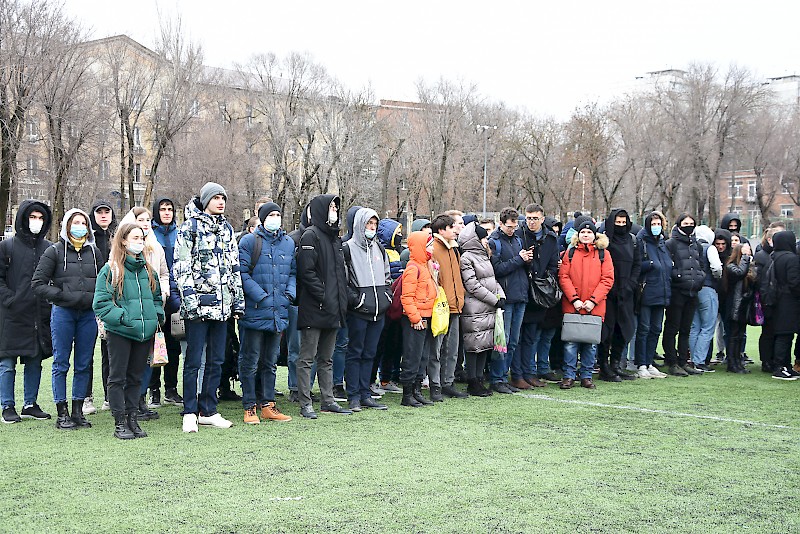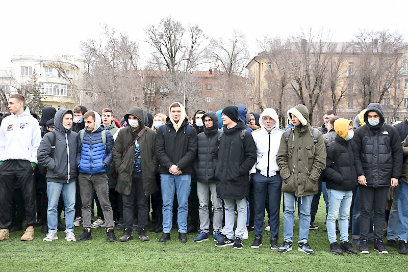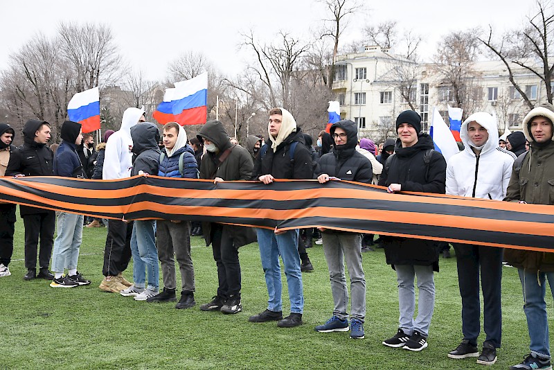 На стадионе Ростовского государственного университета путей сообщения студенты провели флеш- моб: выстроились в форме буквы Z- символа единства, развернули флаги Российской Федерации и огромную Георгиевскую ленточку. Студенты вуза поддерживают российскую армию и желают скорейшего мира.