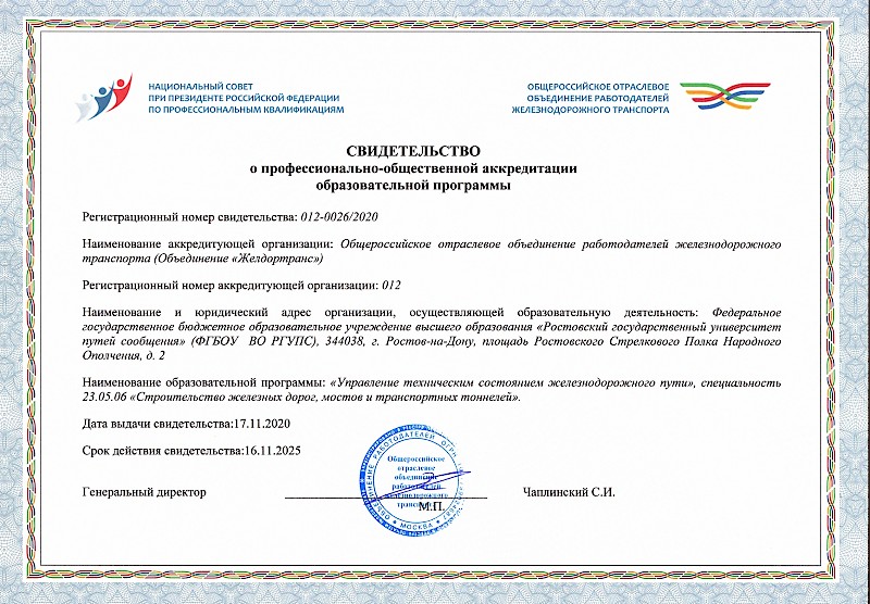 В РГУПС была инициирована и успешно пройдена процедура профессионально-общественной аккредитации образовательных программ в Объединении «Желдортранс» в рамках Программы взаимодействия ОАО «РЖД» с университетскими комплексами железнодорожного транспорта до 2025 г. и в соответствии с Приказом ректора от 03.09.2020 г. № 1320 ос.