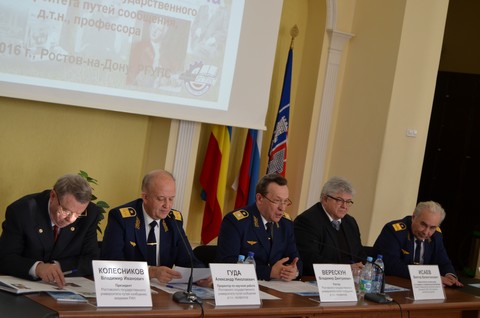 Президиум собрания: ректор РГУПС, д.т.н., профессор В.Д. Верескун, президент РГУПС, академик РАН В.И. Колесников, первый проректор РГУПС, к.т.н., профессор А.В. Челохьян, проректор по научной работе РГУПС, д.т.н., профессор А.Н. Гуда и заместитель начальника по кадрам и социальным вопросам СКЖД- филиала ОАО «РЖД» В.В. Исаев.