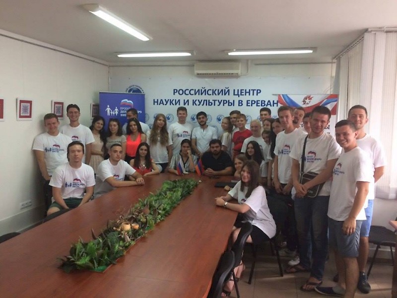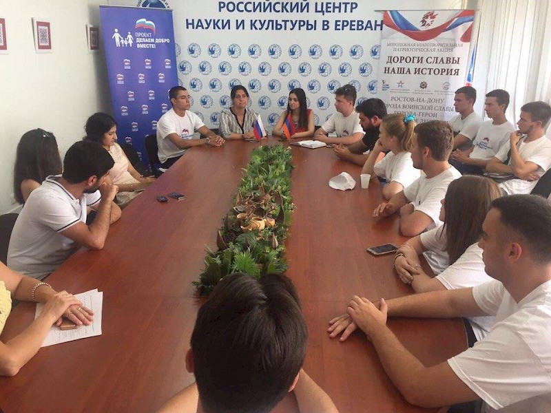 В Российском Центре науки и культуры состоялся Круглый стол по вопросам патриотического воспитания и исторической памяти о Великой Отечественной войне. В мероприятии приняли участие Директор РЦНК Сергей Рыбинский, председатель Ассоциации студентов российских вузов Армении Тигран Малхасян, представители Федерального агентства по делам Содружества Независимых Государств и связям с соотечественниками за рубежом (Россотрудничество) в Армении, художественный руководитель народного вокального ансамбля «Успех» Ася Компаниец, члены молодежного парламента при Законодательном собрании Ростовской области Артак Овакимян и Всеволод Чернявский, участники автопробега «Дороги славы – наша история», студенты российских вузов в Ереване. Собравшиеся обменялись опытом патриотической работы и согласовали действия по совместному проведению молодежных акций в России и Армении.