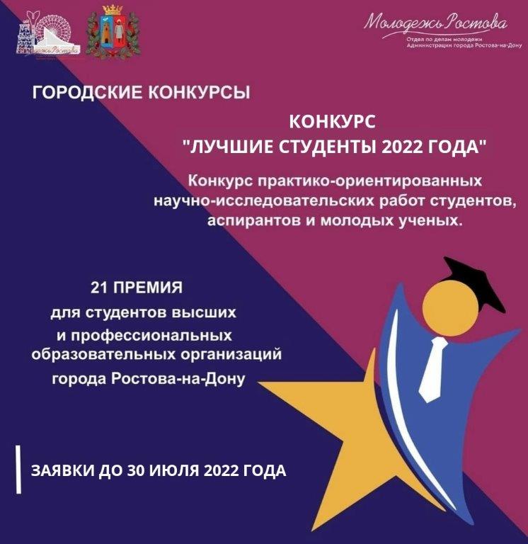 Отдел по делам молодёжи Администрации г. Ростова-на-Дону осуществляет прием заявок на участие в городских конкурсах: «Лучшие студенты 2022 года» и конкурс практико-ориентированных научно-исследовательских работ студентов, аспирантов и молодых ученых.