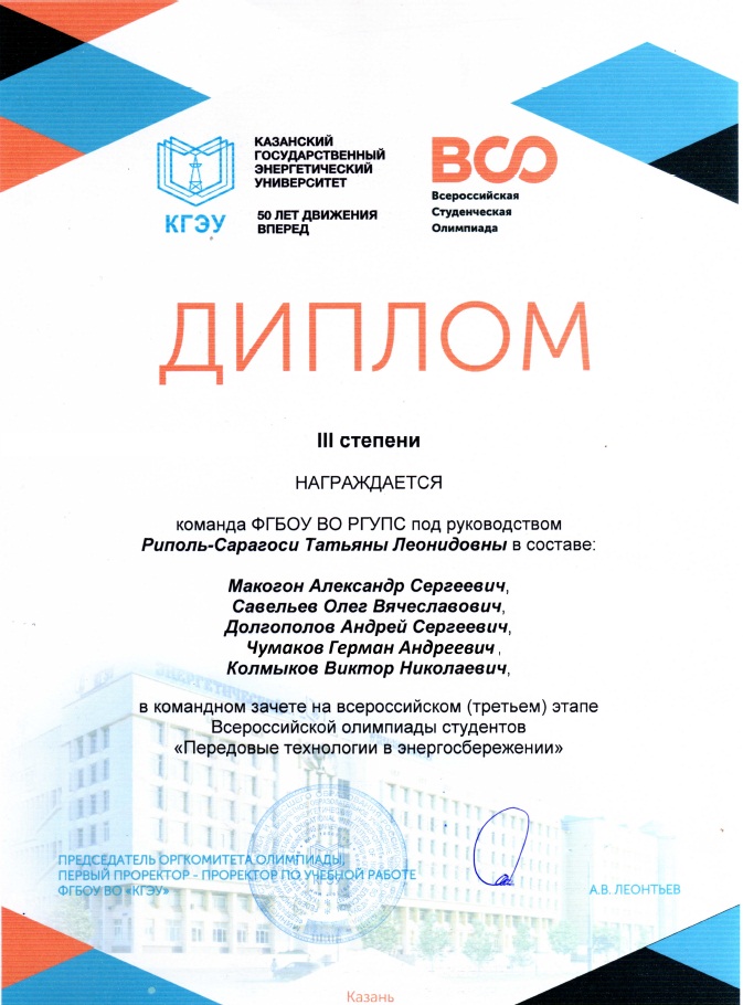Этот успех по праву разделяют преподаватели, готовившие команду к олимпиаде: от кафедры «Теплоэнергетика на ж.д. транспорте» - проф. Риполь-Сарагоси Т.Л., доц. Долгова А.Н., ст. преп. Елманов А.М.; ст. преп. кафедры ТОЭ Безуглый А.В.