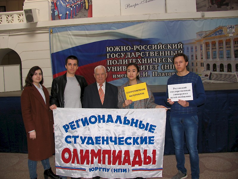 Студенты факультета «Электромеханический» Горбов А.К. и Лепетюхин В.А. и факультета «Строительный» Руденко О.В. и Саупиева А.У. под руководством доцента кафедры «Строительная механика» Шемшуры Б.А. в составе команды РГУПС заняли 3 место в Региональном этапе Всероссийской олимпиады студентов образовательных организаций высшего образования по дисциплине «Сопротивление материалов», проводившейся 21 марта 2019 г. в ФГБОУ ВО «Южно-Российском государственном политехническом университете (НПИ) имени М.И. Платова» г. Новочеркасске.