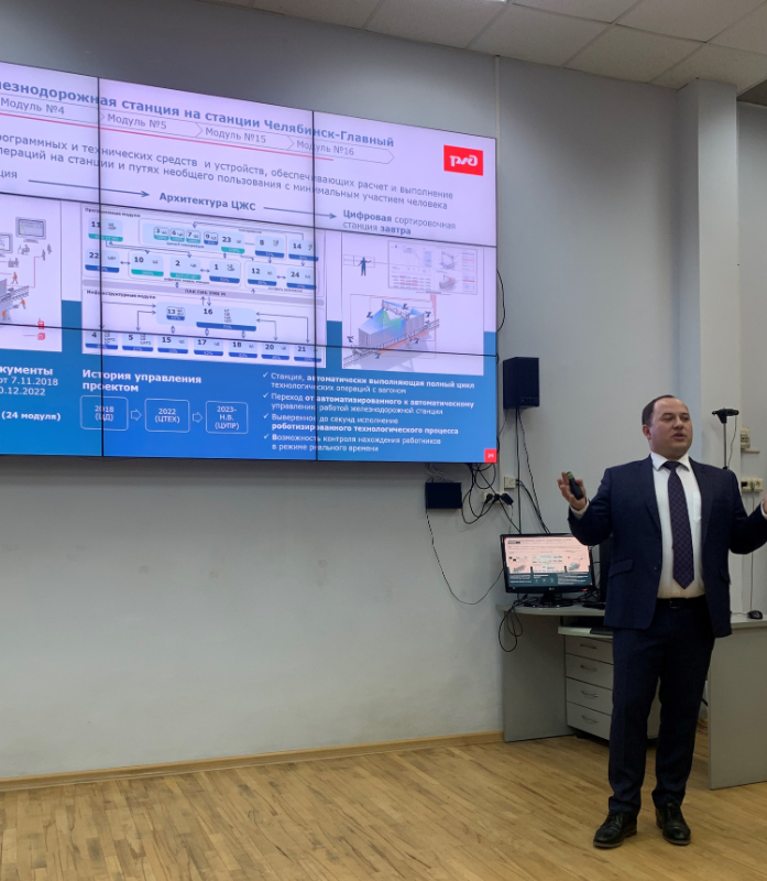 Антон Сергеевич в ходе развернутой лекции ознакомил с особенностями комплексных проектов технологического развития ОАО «РЖД». Подробно рассказал о проекте «Цифровая железнодорожная станция Челябинск-Главный», являющимся комплексом программных и технических средств и устройств, обеспечивающих расчет и выполнение технологических операций на станциях и путях необщего пользования с минимальным участием человека. О взаимоувязке Программных и Инфраструктурных модулей проекта ЦЖС и интеграционном взаимодействии модулей с существующими Автоматизированными системами ОАО «РЖД». Также озвучил информацию о проекте развития высокоскоростного движения и современных технологиях, применяемых в конструкции нового электропоезда для высокоскоростной магистрали Москва-Санкт Петербург. Рассказал о внедрении беспилотного движения на МЦК в г. Москва и проекте по разработке конструкции железнодорожного пути, позволяющим существенно повысить пропускную способность.