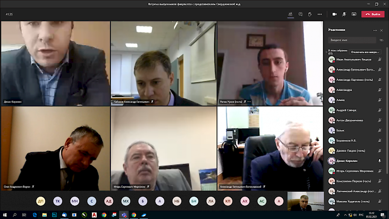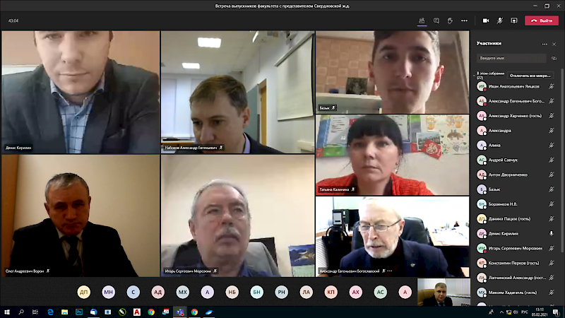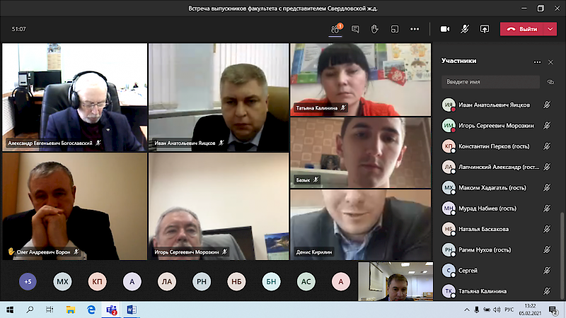 В рамках традиционного распределения молодых специалистов на Электромеханическом факультете в формате видеоконференцсвязи состоялась встреча студентов выпускного курса специальности «Подвижной состав железных дорог» с заместителем начальника по кадрам и социальным вопросам ВЧДЭ Свердловск-Сортировочная структурного подразделения Свердловской дирекции инфраструктуры – структурного подразделения ЦДИ – филиала ОАО «РЖД» Кирилиным Денисом Анатольевичем. В рабочей встрече принимали участие декан Электромеханического факультета И.А. Яицков, заместитель декана по учебной работе, заведующие выпускающих кафедр факультета, представители ВЧДЭ Свердловск-Сортировочная.