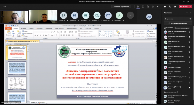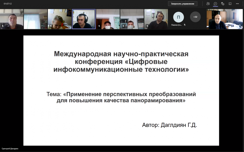 7 октября факультетом ИТУ в дистанционном формате была проведена Международная научно-практическая конференция «Цифровые инфокоммуникационные технологии». С приветственным словом к участникам обратился проректор по научной работе РГУПС, доктор технических наук, профессор Гуда Александр Николаевич. Ученые университета представили свои доклады на пленарном заседании и секциях. Общее количество участников превысило 150 человек в числе которых были представители из Санкт-Петербурга, Самары, Иркутска, Туапсе, Луганска и др. По результатам работы конференции будет выпущен сборник статей, в который войдут материалы более 50 докладов.