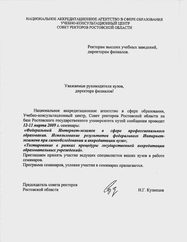 Национальное аккредитационное агентство в сфере образования, Учебно- консультационный центр, Совет ректоров Ростовской области на базе Ростовского государственного университета путей сообщения проводят 12-13 марта 2009 г. семинары: