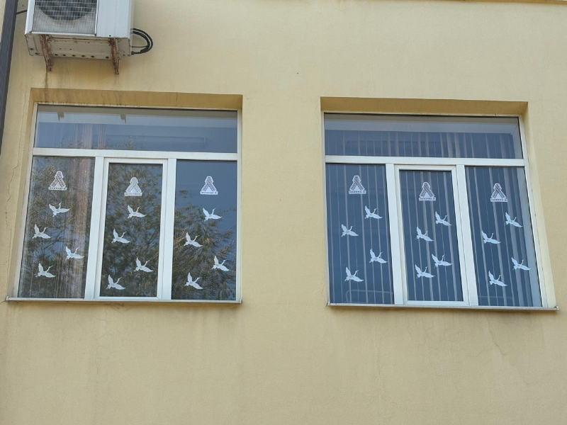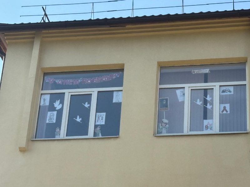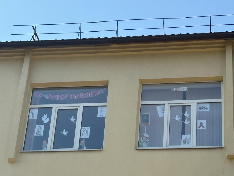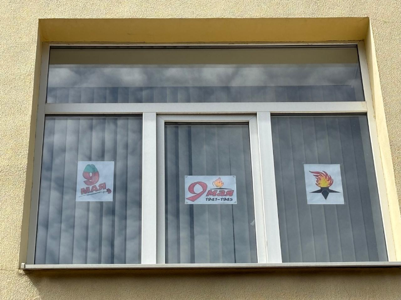 Ребята украсили к 9 Мая окна своих учебных классов рисунками, картинками, фотографиями, надписями и трафаретами, отражающими Подвиг советского народа.