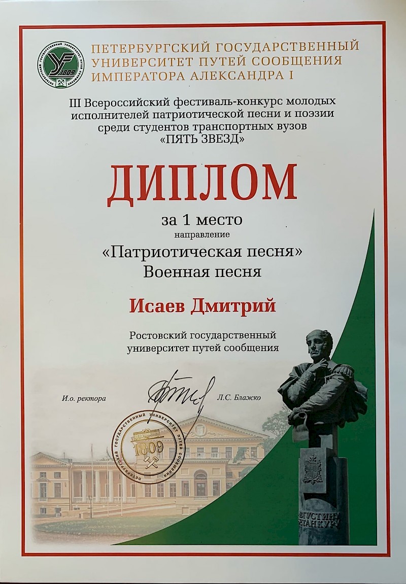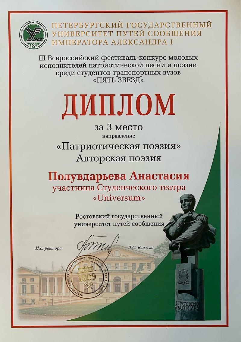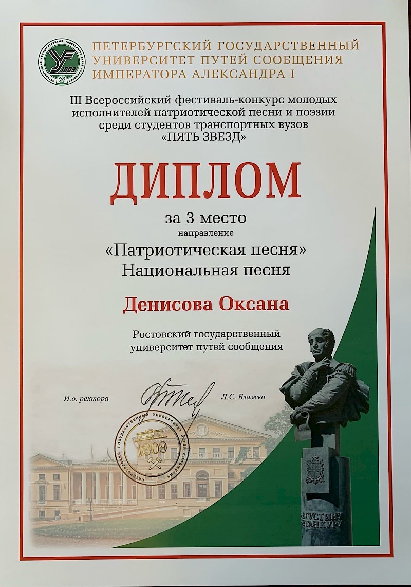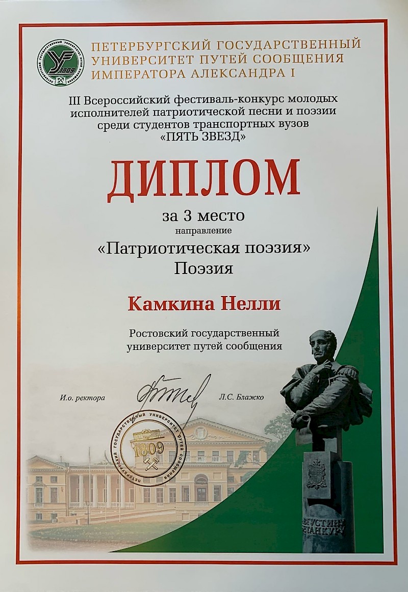 Всероссийский фестиваль – конкурс молодых исполнителей патриотической песни и поэзии среди студентов транспортных вузов «Пять звезд», проходил заочно в Санкт-Петербурге. На профессиональную оценку жюри было направлено пять видеозаписей номеров, из них домой с наградой вернулись четыре. Наши студенты заняли призовые места в направлениях: «Патриотическая поэзия» (3 место), «Патриотическая песня» (национальная песня, 3 место), «Патриотическая песня» (военная песня, 1 место). В конкурсе принимали участие: Дмитрий Исаев, Анастасия Полувдарьева, Оксана Денисова, Нелли Камкина и Екатерина Бородина. Хотелось бы отметить, что одно из призовых конкурсных стихотворений написал наш студент – Артем Платохин. Видеосъемку номеров для фестиваля, организовали участники студенческого объединения «Скотч» (рук. Е. Браун). Мы поздравляем ребят с победой и представляем Вашему вниманию видео конкурсных работ!
