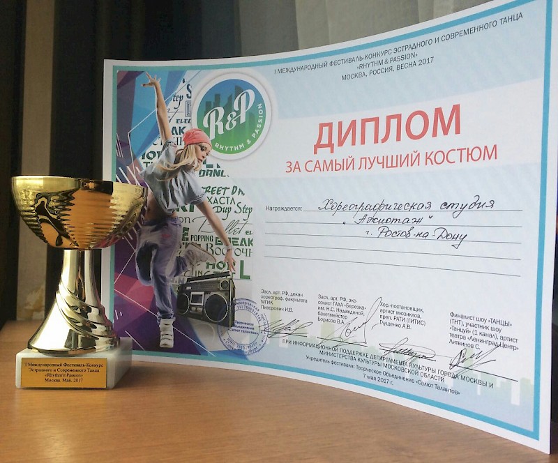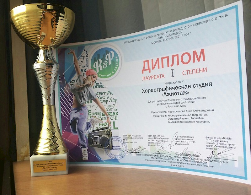 Юные танцоры заняли первое место на Международном фестивале-конкурсе эстрадного и современного танца "RHYTM&RASSION". Профессиональное жюри дало высокую оценку не только постановкам и исполнению, но и костюмам наших ажиотажевцев, присудив им диплом "За самый лучший костюм". От всей души поздравляем руководителя - Анну Новоточенову и участников студии с победой и желаем покорения новых вершин!