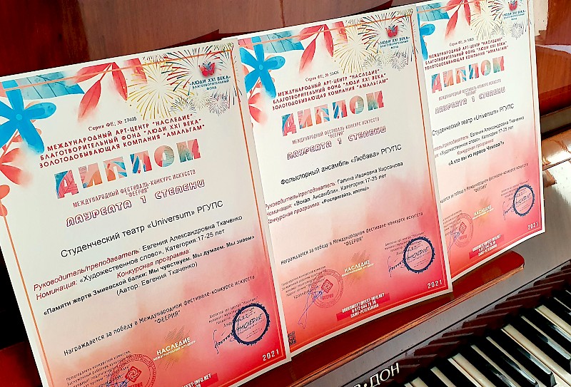 Не прекращается поток побед творческих коллективов Дворца культуры РГУПС даже в "удаленных" условиях. Фольклорный ансамбль "Любава" (рук. Галина Кирсанова) с номером "Роспрягайте, хлопцi" и Театр "Universum" (рук. Евгения Ткаченко) с двумя постановками "А кто вы из героев Чехова?" и "Памяти жертв Змиевской балки" (автор текста - руководитель коллектива) стали Лауреатами заочного Международного фестиваля-конкурса искусств "Феерия".