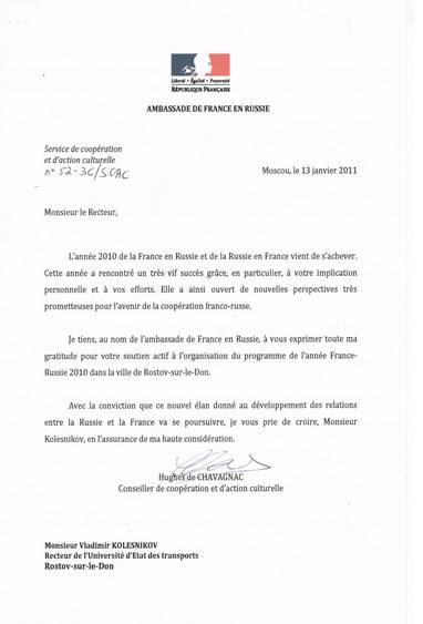 Посольство Франции в России в лице Советника по сотрудничеству и культуре г-на Уго де Шавиньяка направило благодарственное письмо в адрес нашего университета и лично ректора, академика РАН Владимира Ивановича Колесникова, в котором подчеркивается большая роль РГУПС в реализации комплекса мероприятий, приуроченных к прошедшему Году Франции в России и России во Франции.
