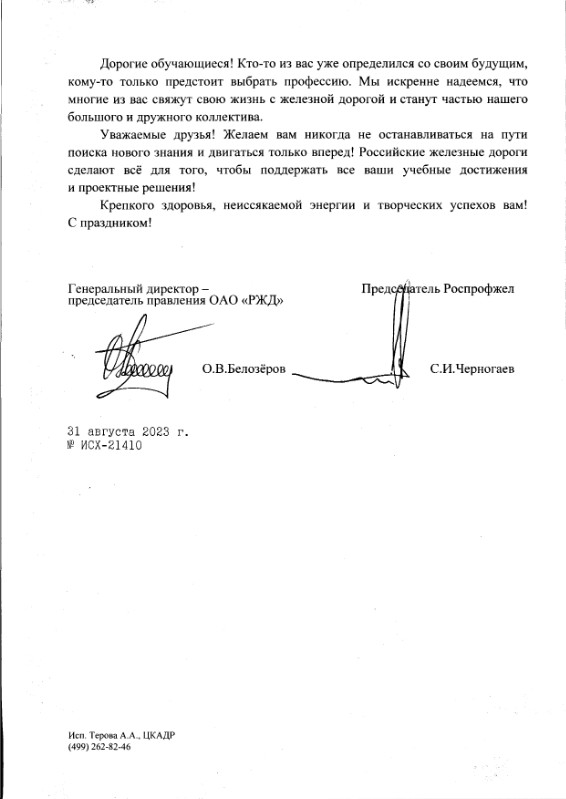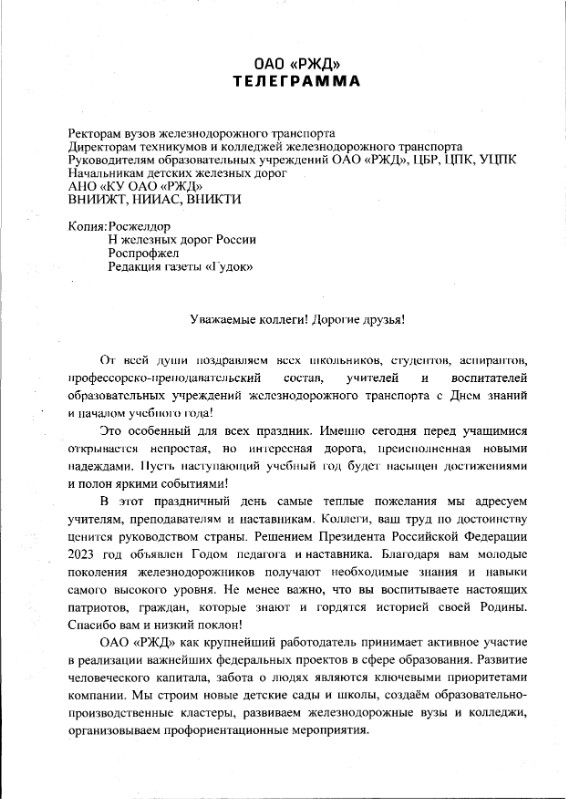 Поздравление Генерального директора-председателя правления ОАО «РЖД» О.В. Белозерова