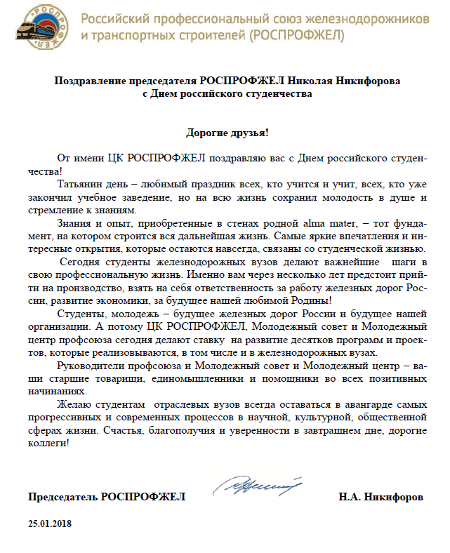 Поздравление председателя РОСПРОФЖЕЛ Николая Никифорова с Днем российского студенчества