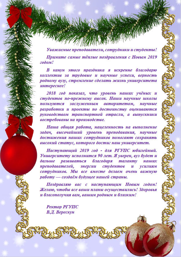Поздравление ректора РГУПС Верескуна В.Д. с наступающим Новым годом.