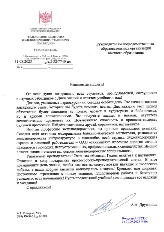 Поздравление руководителя Росжелдора А.А. Дружинина с Днем Знаний