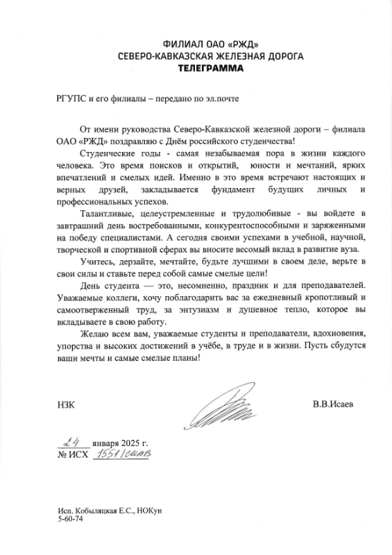 Поздравление с Днем российского студенчества от имени руководства Северо-Кавказской железной дороги
