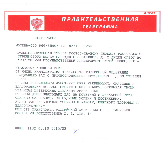 Поздравление с Днем учителя Министра Транспорта РФ В. Г. Савельева