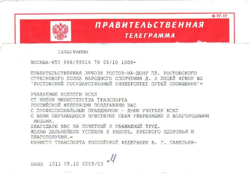 Поздравление с Днем учителя от министра транспорта Российской Федерации В. Г. Савельева