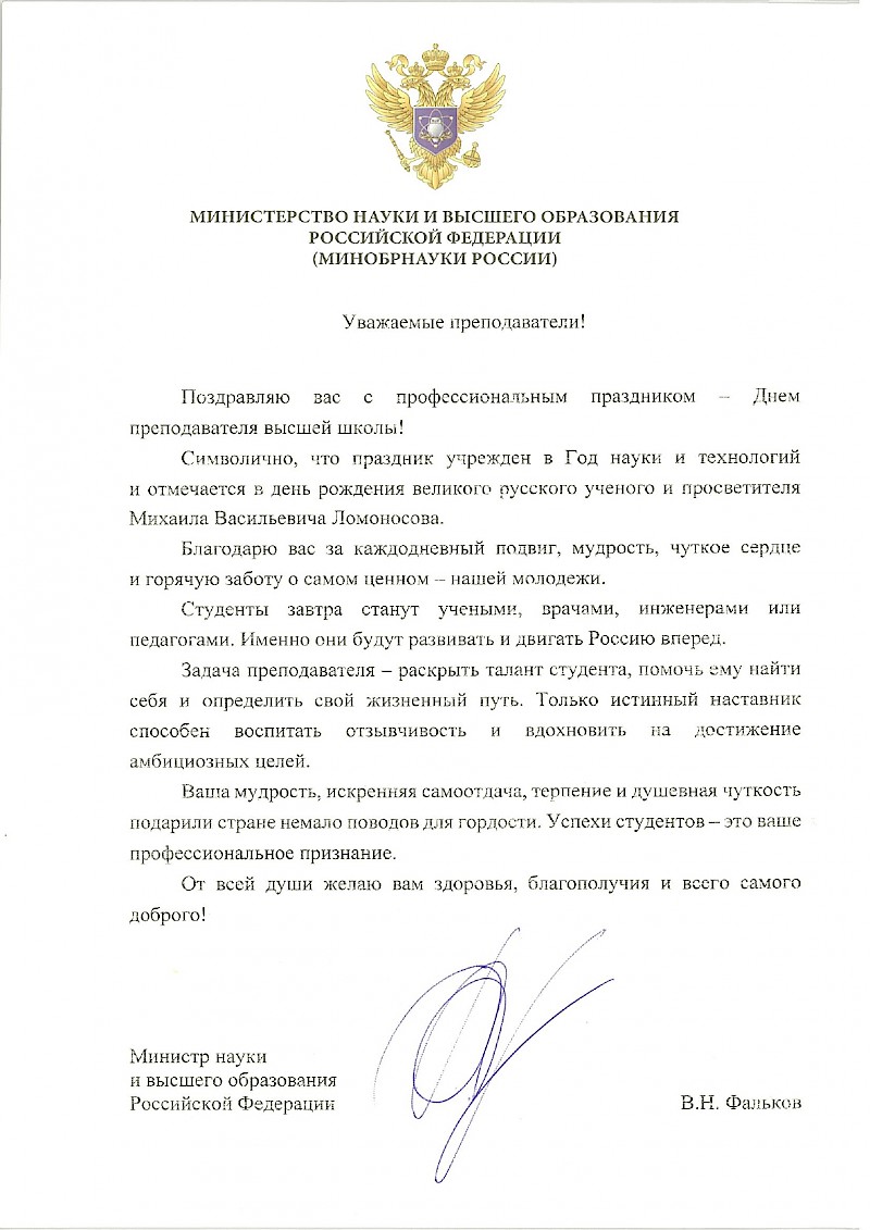 - Поздравления Министра науки и высшего образования Российской Федерации В.Н. Фалькова с Днем преподавателя высшей школы