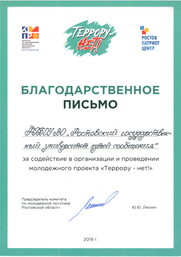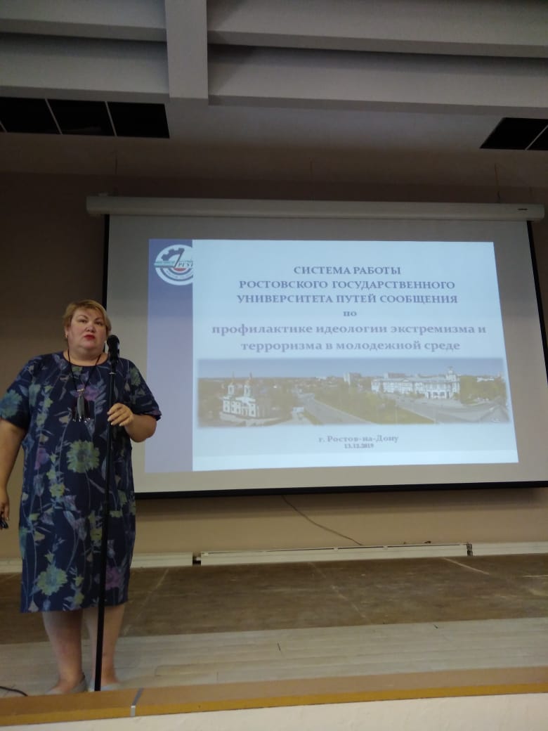 13 сентября 2019 года представители управления воспитательной работы и первичной профсоюзной организации студентов РГУПС приняли участие в семинаре по теме профилактики экстремизма и терроризма в молодежной среде «Террору-нет!», организованном Комитетом по молодежной политике Ростовской области и ГАУ «Центр патриотического воспитания молодежи Ростовской области» в рамках большого молодежного проекта «Террору - нет!». В ходе семинара эксперты с участниками обсудили вопросы медиабезопасности; информационных угроз; профилактики негативных явлений. Сотрудники управления воспитательной работы представили систему работы РГУПС по профилактике идеологии экстремизма и терроризма в молодежной среде.
