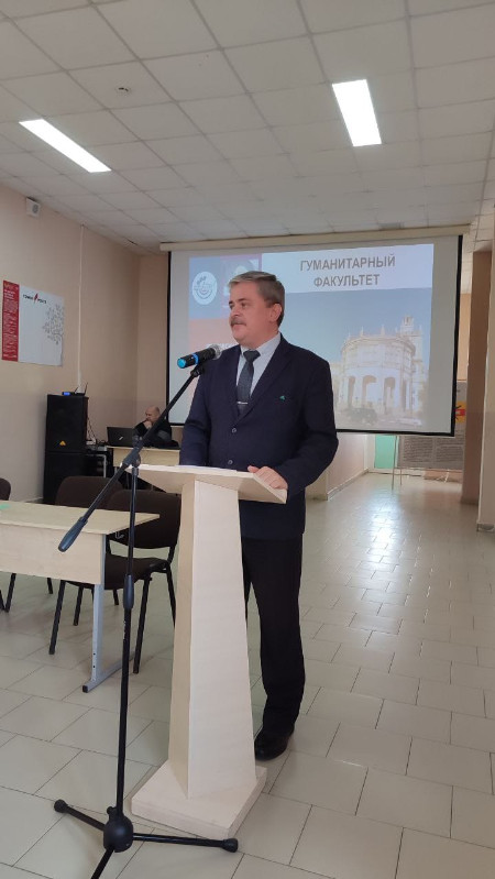 В своём выступлении перед учащимися и преподавателями школ, декан Гуманитарного факультета В.А. Осипов продемонстрировал и подробно прокомментировал презентацию о РГУПС, рассказал о направлениях подготовки, реализуемых кафедрами факультета, правилах поступления и обучения в университете и ответил на вопросы участников встречи.