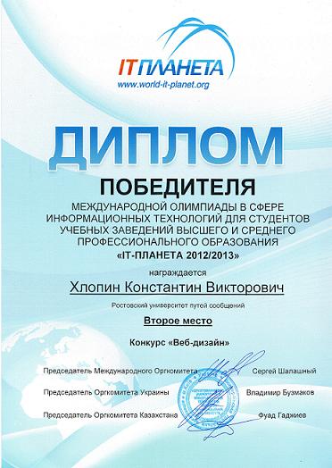Программист управления информатизации Хлопин Константин Викторович (магистрант) стал призером международной олимпиады (финал которой прошел с 1 по 4.06 в г.Киеве, Украина) в сфере информационных технологий для студентов учебных заведений высшего и среднего профессионального образования "IT-планета 2012/2013" и занял 2-е место в конкурсе "Веб-дизайн"