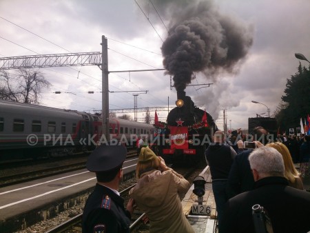 Встречать музей на колесах, собранный из исторического подвижного состава времен Великой Отечественной войны, пришло множество людей: ветераны войны и вооруженных сил, учащиеся, руководители министерств и ведомств республики, сотрудники ГУ МЧС России по КБР, представители общественности и духовенства, делегации предприятий и организаций, железнодорожники, рабочие, горожане, потомки тех, кто внес свой вклад в великую Победу. После объявления ведущим 72-летней годовщины Великой Победы вдали послышался протяжный гудок, и под звуки военного марша нарядный поезд, дымя паровозами, прибыл на железнодорожный вокзал Нальчика. Его привезли два паровоза, один из которых участвовал в Сталинградской битве. Сияющие лица, всеобщее ликование, цветы, шары, флаги... После того, как отзвучали приветственные паровозные гудки, открытая платформа военного железнодорожного состава превратилась в импровизированную сцену, с которой заместитель председателя правительства КБР - министр образования, науки и делам молодежи Нина Емузова поприветствовала участников акции и поблагодарила её инициаторов.