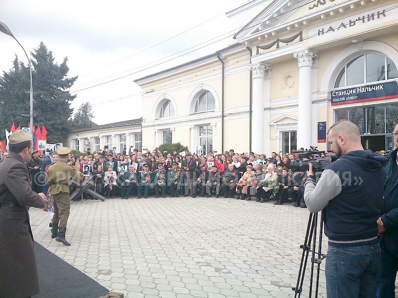 На перроне прошла инсценировка встречи вернувшихся с войны солдат с любящими девушками, перешедшая в вальс Победы. Состоялось яркое театрализованное представление, подготовленное для ветеранов и горожан творческими коллективами Дворца культуры железнодорожников на станции «Ростов-Главный» и Ростовского государственного университета путей сообщения. В ходе мероприятия были зачитаны страницы из символической книги памяти, рассказывающие о жителях республики, сражавшихся на фронтах и работавших в тылу, героях, награжденных орденами и медалями, о тех, кто отдал свою жизнь за свободу и независимость нашего Отечества. После минуты молчания концертная программа продолжилась вокально-хореографическими композициями, театрализованными постановками «Письма с фронта», «Ночные ведьмы» (об авиационном полке, воевавшем на Северном Кавказе), «Военные здравницы» (о госпиталях Северного Кавказа, возвращавших в строй раненых бойцов), песенным попурри военных лет. В завершение праздничной программы вынесли победное знамя и все дружно исполнили песню «День Победы», после чего присутствующих пригласили посетить поезд-музей, чтобы еще глубже окунуться в атмосферу прошлого. Также во время мероприятия на перроне вокзала спасателями Центра по гражданской обороне и чрезвычайным ситуациям городского округа Нальчик была развернута полевая кухня. Все желающие смогли отведать гречневую кашу с тушенкой и горячий чай.
