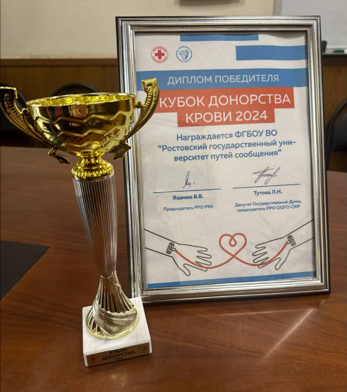 За активное участие в Кубке донорства крови Ростовской области, проходившем в сентябре 2024 года, дипломом победителя был награжден Ростовский государственный университет путей сообщения. Награду вручили председатель ростовского регионального отделения «Российского Красного Креста» В.В. Ященко и депутат Законодательного Собрания Ростовской области, председатель комитета Законодательного Собрания Ростовской области по социальной политике, труду, здравоохранению и делам военнослужащих Е.В. Елисеева.